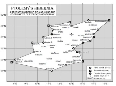 A reconstruction of Ptolemy’s map of Ireland (taken from ‘Ptolemy’s map of Ireland: a modern decoding’ by R. Darcy & William Flynn). Claudius Ptolemy was an Egyptian geographer and mathematician, who lived and worked in Alexandria. He created his map of Ireland around AD140.