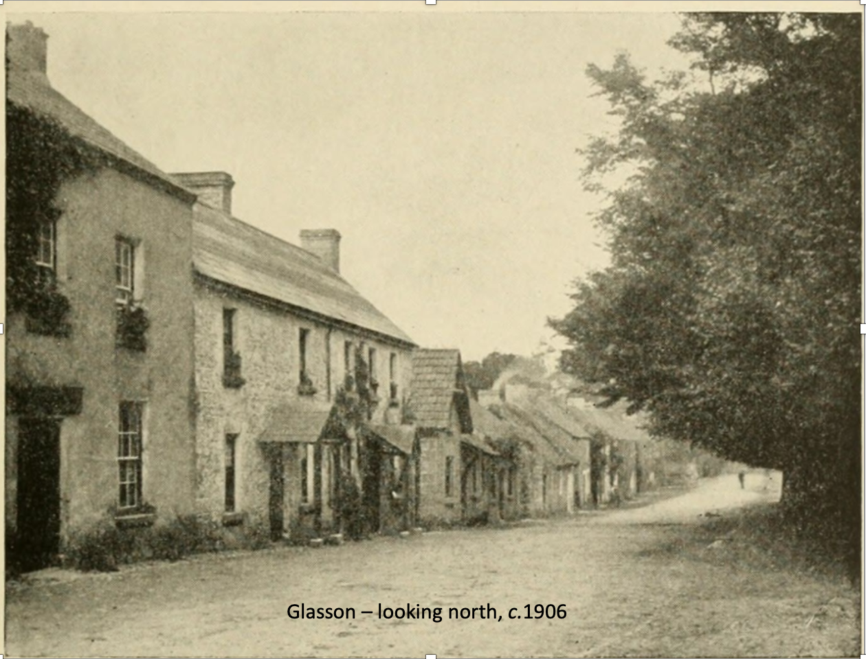 Summary – This lecture will discuss the development of settlement in Glasson and the surrounding area from the year 1600 to around 1900. Glasson is commonly thought to be an estate village developed by the owners of nearby Waterstown House, but this is not the whole story. In the nineteenth century, Glasson was famous for its mills, and the first settlement in the area may have developed around the mill on the Tullaghan river, a short distance to the east of the present bridge. This mill was in existence as early as 1630, and was known as Mollinglassen or Muileann Ghlasáin ‘the mill of Glasson’.